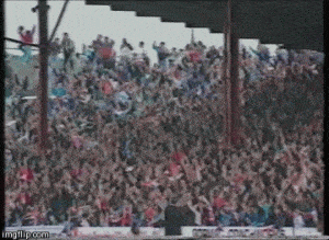 The ensuing bounce is so fleeting in the highlight of the goal that it’s hard to appreciate fully, it’s only when slowed down and looped into GIF form that the full majesty is revealed. The scene on the terrace is like a Where’s Wally picture brought to life, each loop reveals another layer of beldam: running man in the top left corner, Happy Monday’s Bez in the white jumper, a perfectly executed standing jump over the hoarding in the bottom left…the list goes on. This bounce is my personal favourite; it perfectly encapsulates the best elements of an unadulterated bounce.